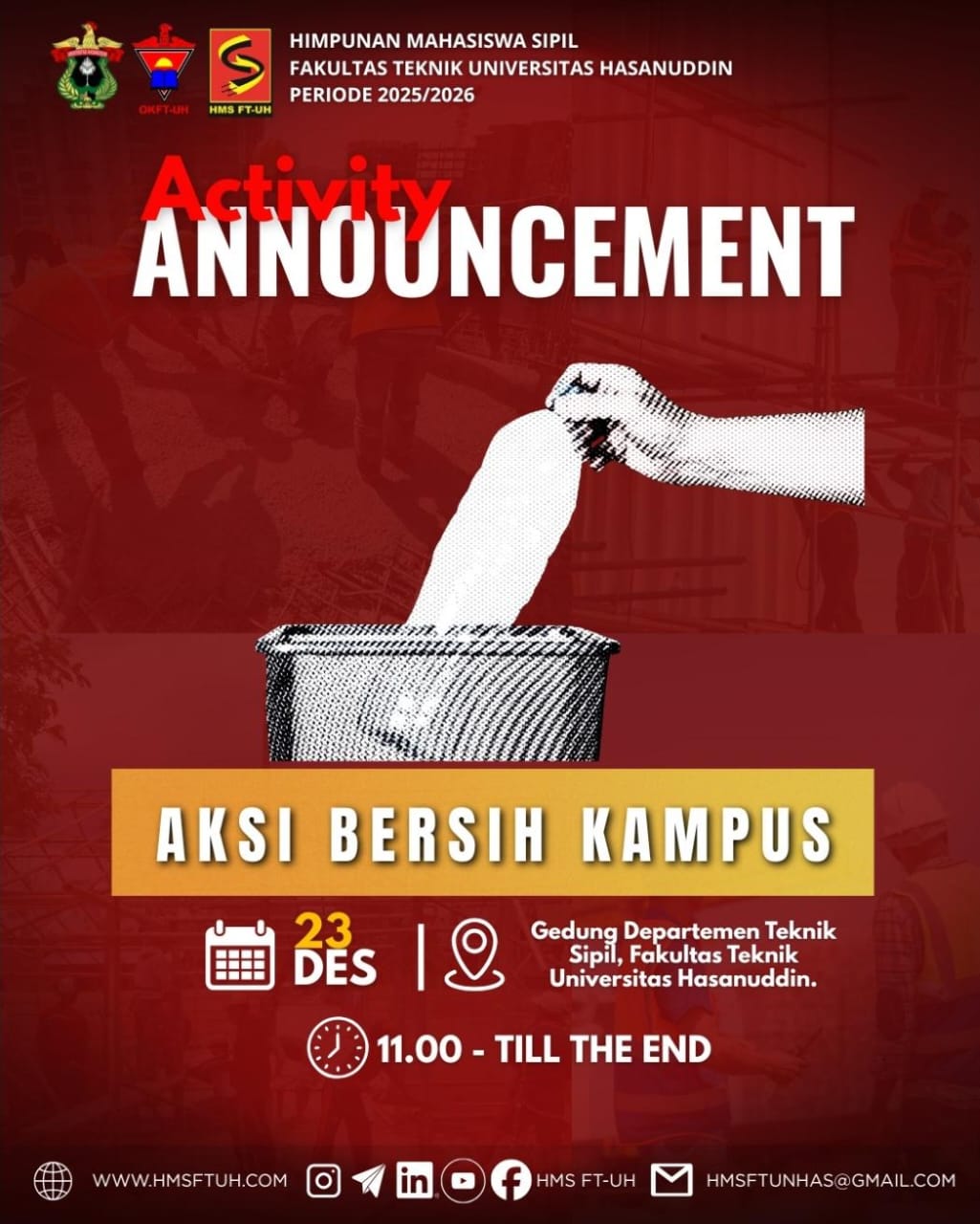 Himpunan Mahasiswa Sipil Fakultas Teknik Universitas Hasanuddin (HMS FT-UH) di bawah Kelompok Khusus Forum Studi Interaksi Lingkungan atau disingkat FOSIL memiliki salah satu jobdesk yaitu Aksi Bersih Kampus #5, didasari dari aspek kepedulian lingkungan dan diharapkan dapat meningkatkan pemahaman juga kesadaran anggota HMS FT-UH terhadap permasalahan lingkungan dimulai dari permasalahan sampah di daerah kampus Fakultas Teknik Universitas Hasanuddin.