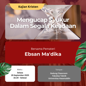Tema Kajian : “Mengucap syukur dalam segala keadaan”Pemateri : Ebsan Ma’dika30 September 2025 Sebagai orang Kristen kita selalu diajar cara untuk bersyukur yang merupakansikap hati yang mengakui segala sesuatu baik yang menyenangkan maupun…