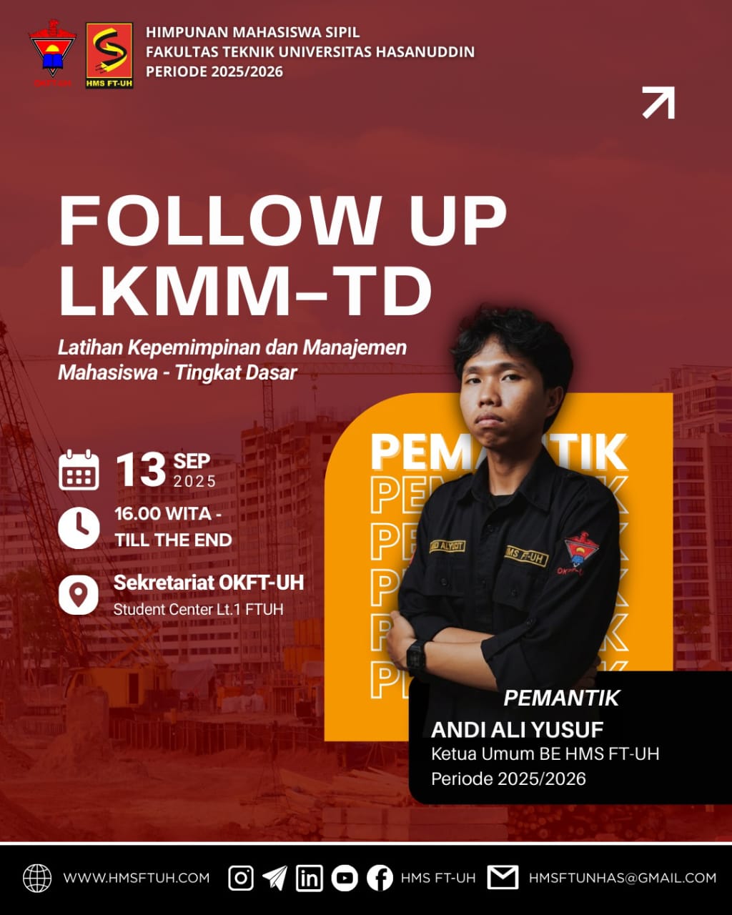 Kegiatan Follow Up LKMM-TD #2 merupakan agenda lanjutan dari follow up pertama. Melalui kegiatan ini materi yang dibawakan lebih terperinci mengenai materi-materi yang di dapatkan pada saat pelaksanaan LKMM-TD oleh OKFT-UH. Khususnya pada materi Manajemen dan juga kepemimpinan. Peserta di harapkan mampu memecahkan suatu masalah dan mengasah problem solving mereka, yang nantinya mampu mereka terapkan pada keilmuan Teknik Sipil. Mengatur dan menjadwalkan sesuatu bukanlah hal yang mudah bagi seorang mahasiswa, dengan adanya follow up ini, kader mampu untuk mengetahui skala prioritas dan cara mengatur dan menjadwalkan kehidupan mereka di dunia ketekniksipilan.